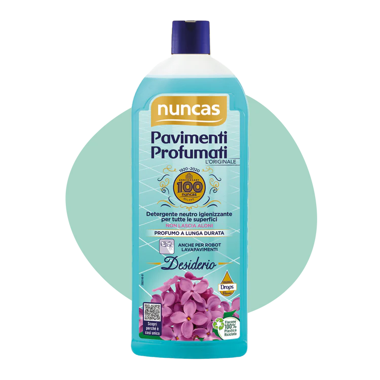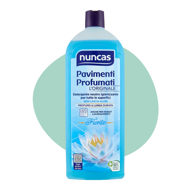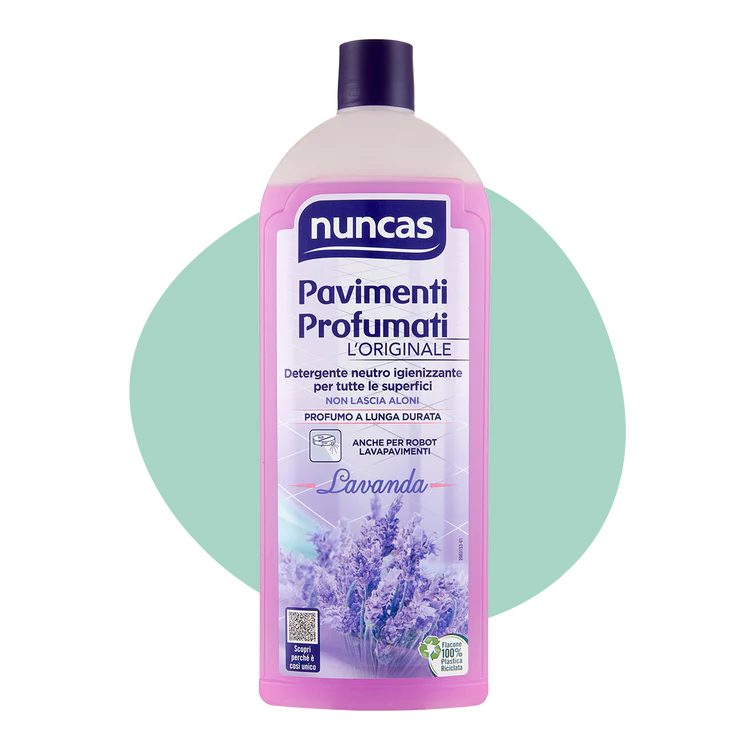 Nuncas Pavimenti Profumati Detergente , un detergente neutro profumato ad azione igienizzante e deodorante per la pulizia di pavimenti, piastrelle e superfici lavabili della casa. Non lascia aloni e non occorre risciacquare.
